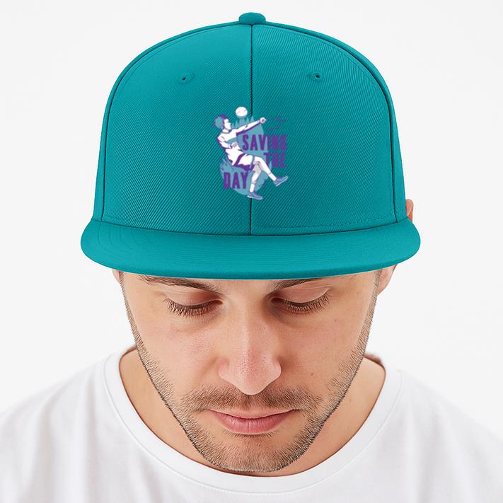The Soccer Player Kicking A Ball With The Words Saving The Day Snapback Hat Snapback Hat is a timeless streetwear essential, built with a structured 6-panel silhouette and a durable cotton or cotton-blend twill fabric. The flat brim adds a bold, modern edge, while the adjustable snapback closure allows for a personalized fit.
